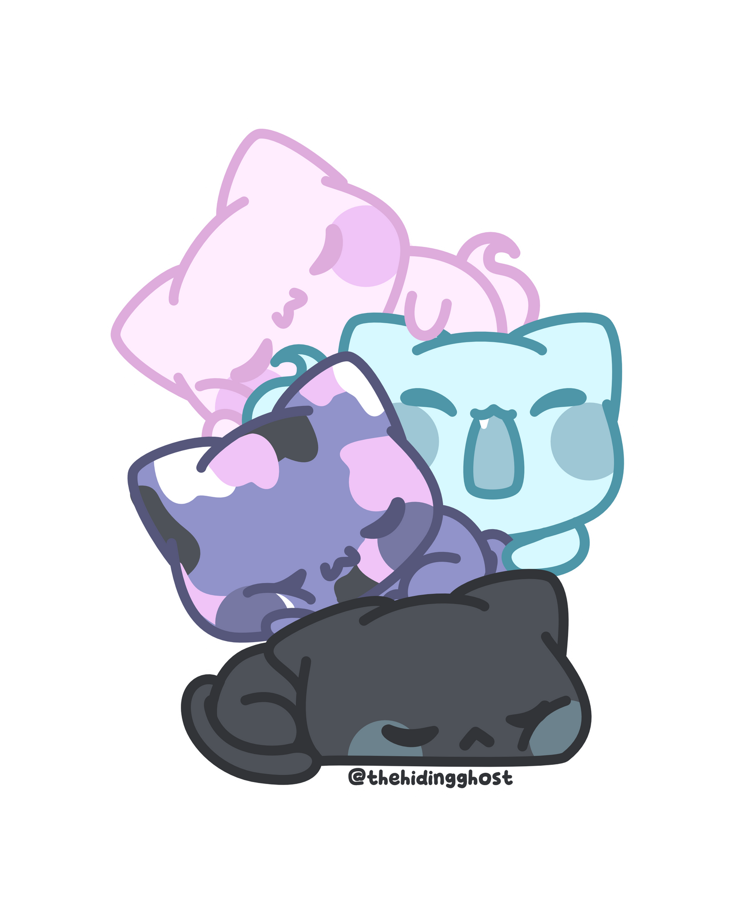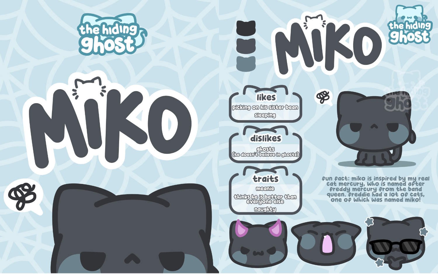 The gang met eachother at the haunted house they all live in! The house is haunted by two twin cat spirits, Cat Ghost and Cat Ghoul. Two sibling stray cats, Miko and Bean, stumbled upon the house and have made it their home, except they find out that its haunted! Bean is scared of ghosts and Miko doesn't even believe in ghosts, but they learn to live all together!