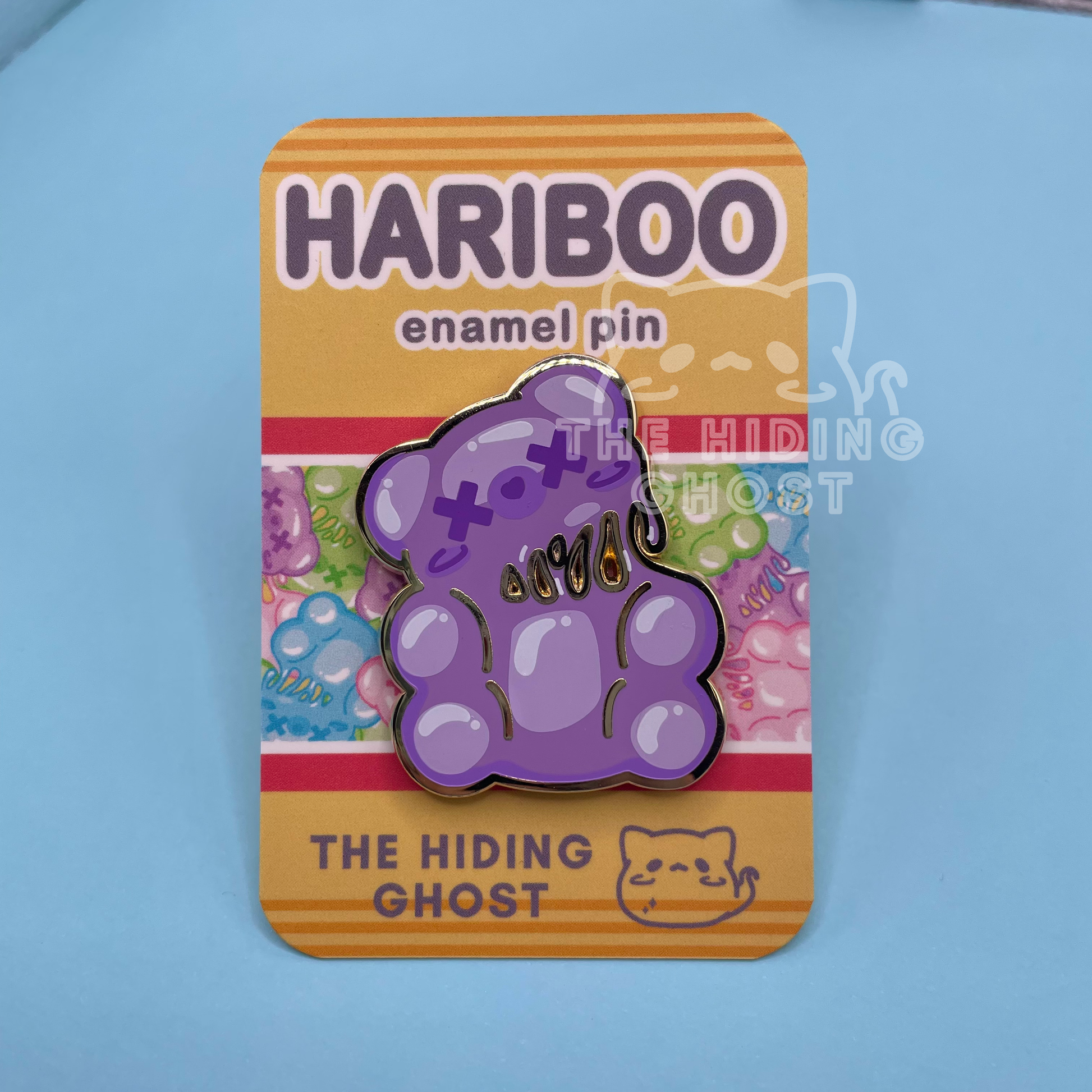 This Purple Spooky Gummy Bear enamel pin is perfect for anyone who loves cute and spooky things!